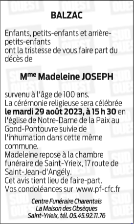 Décédée à La Rochefoucauld (16110, France) le mercredi 23 août 2023 à l'âge de 100 ans