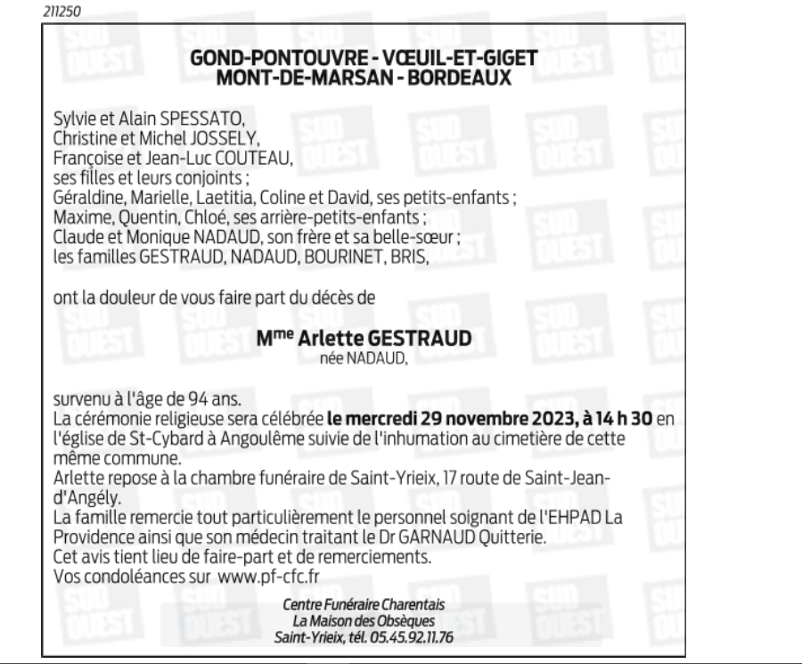 Décédée à Le Gond Pontouvre (16160, France) le dimanche 26 novembre 2023 à l'âge de 94 ans