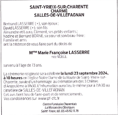 Décédée à Saint-Yrieix-sur-Charente (16710, France) le mardi 17 septembre 2024 à l'âge de 73 ans