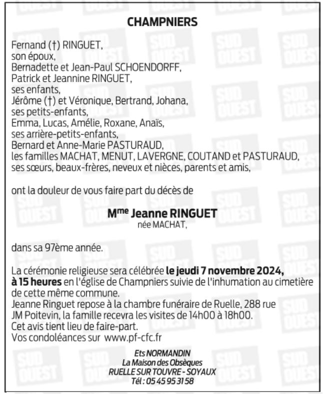 Veuve de Monsieur FERNAND RINGUET