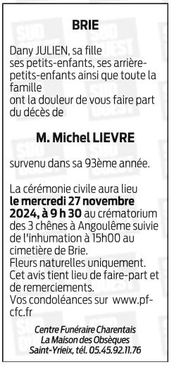 Décédé à Le Gond Pontouvre (16160, France) le samedi 23 novembre 2024 à l'âge de 92 ans