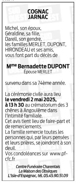 Décédée à Châteaubernard (16100, France) le dimanche 27 avril 2025 à l'âge de 73 ans