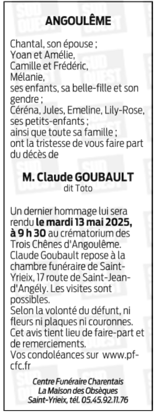 Décédé à Soyaux (16800, France) le dimanche 4 mai 2025 à l'âge de 70 ans