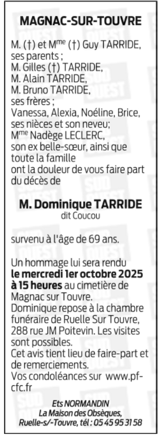 Décédé à Saint-Michel (16470, France) le dimanche 28 septembre 2025 à l'âge de 69 ans
