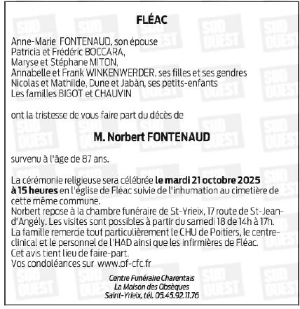 Décédé à Soyaux (16800, France) le mardi 14 octobre 2025 à l'âge de 87 ans