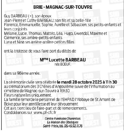 Décédée à Saint-Michel (16470, France) le mardi 21 octobre 2025 à l'âge de 97 ans