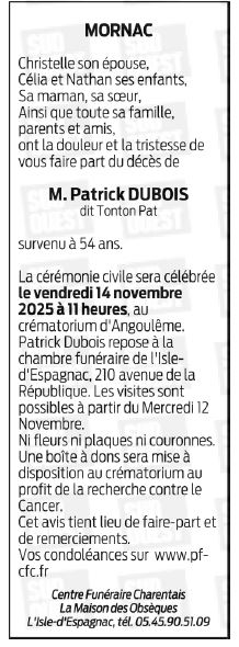 Décédé à Soyaux (16800, France) le samedi 8 novembre 2025 à l'âge de 54 ans