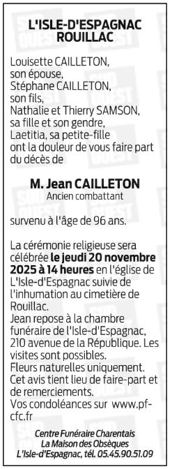Décédé à L'Isle-d'Espagnac (16340, France) le samedi 15 novembre 2025 à l'âge de 96 ans