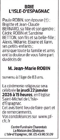 Décédé à Saint-Michel (16470, France) le jeudi 15 janvier 2026 à l'âge de 83 ans