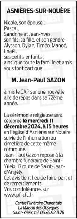 Décédé à Saint-Michel (16470, France) le jeudi 5 décembre 2024 à l'âge de 72 ans