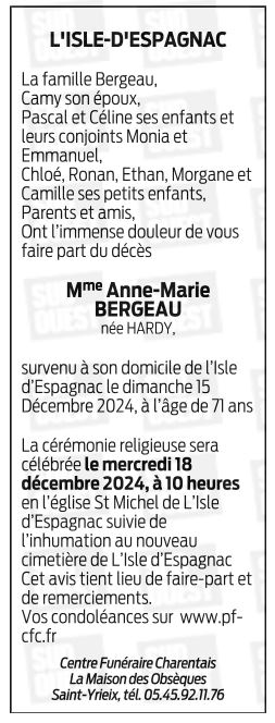 Décédée à L'Isle-d'Espagnac (16340, France) le dimanche 15 décembre 2024 à l'âge de 71 ans