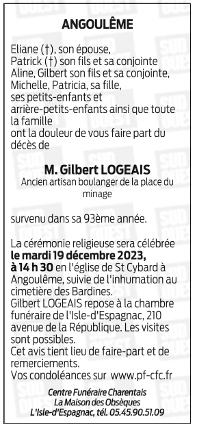 Décédé à Angoulême (16000, France) le jeudi 14 décembre 2023 à l'âge de 92 ans