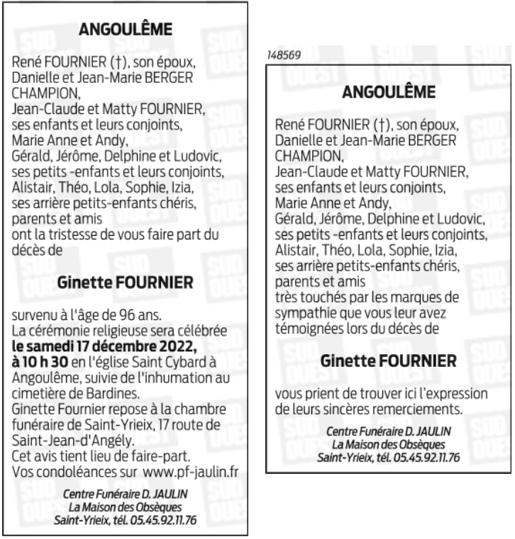 Décédée à Ruelle-sur-Touvre (16600, France) le lundi 12 décembre 2022 à l'âge de 96 ans