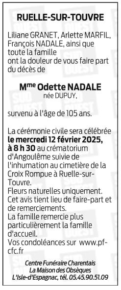 Décédée à Bouex (16410, France) le dimanche 9 février 2025 à l'âge de 105 ans
