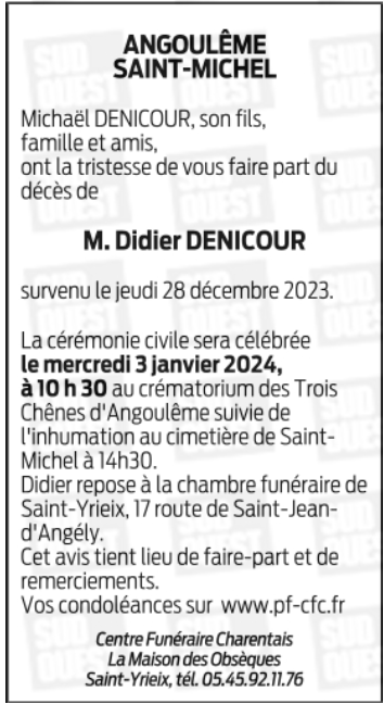 Décédé à Saint-Michel (16470, France) le jeudi 28 décembre 2023 à l'âge de 68 ans