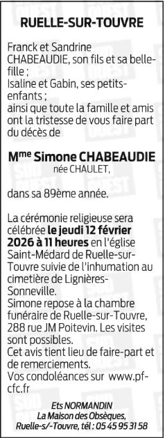 Veuve de Monsieur LUCIEN CHABEAUDIE
