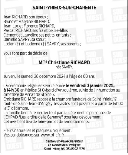 Décédée à Angoulême (16000, France) le samedi 28 décembre 2024 à l'âge de 88 ans