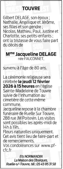 | Madame JACQUELINE DELAGE née FAUCONNETDomiciliée à Montmoreau Saint Cybard (16190, France) Née à Magnac-sur-Touvre (16600, France) le vendredi 21 septembre 1945 Décédée à Montmoreau Saint Cybard (16190, France) le jeudi 5 février 2026 à l'âge de 80 ans Epouse de Monsieur GILBERT DELAGE