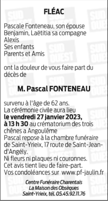 Décédé à Linars (16730, France) le dimanche 22 janvier 2023 à l'âge de 62 ans