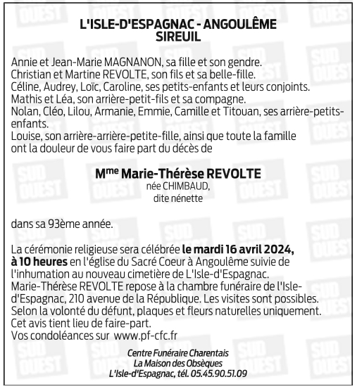Décédée à L'Isle-d'Espagnac (16340, France) le mercredi 10 avril 2024 à l'âge de 92 ans