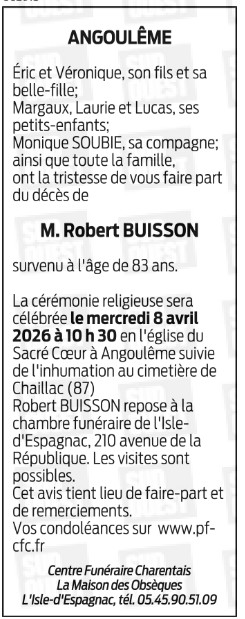 Décédé à Saint-Michel (16470, France) le mercredi 1 avril 2026 à l'âge de 83 ans