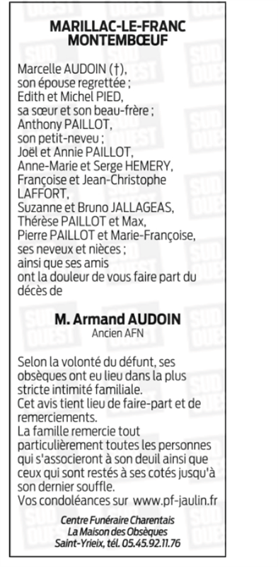 Né à Mouzon (16310, France) le mercredi 15 janvier 1936