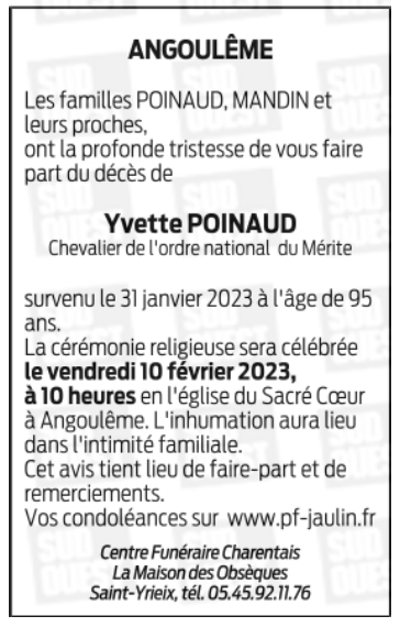 Décédée à Ruelle-sur-Touvre (16600, France) le mardi 31 janvier 2023 à l'âge de 95 ans