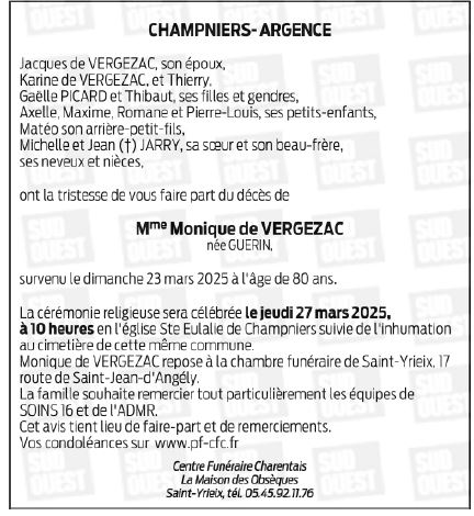 Décédée à Champniers (16430, France) le dimanche 23 mars 2025 à l'âge de 80 ans