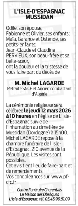 Décédé à Saint-Michel (16470, France) le lundi 9 mars 2026 à l'âge de 89 ans