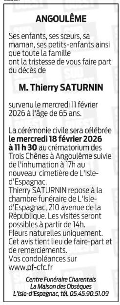 Décédé à Ruffec (16700, France) le mercredi 11 février 2026 à l'âge de 65 ans