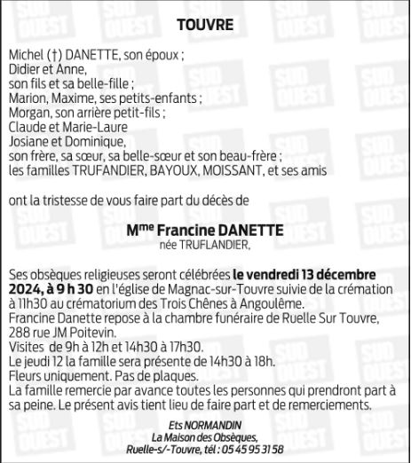 Madame FRANCINE DANETTE née TRUFLANDIER