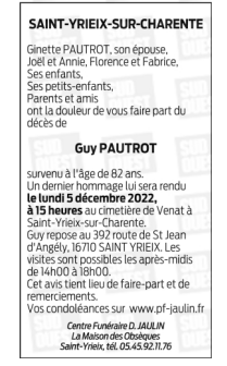 Décédé à Saint-Yrieix-sur-Charente (16710, France) le jeudi 1 décembre 2022 à l'âge de 82 ans