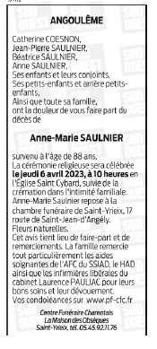 Décédée à Angoulême (16000, France) le dimanche 2 avril 2023 à l'âge de 88 ans