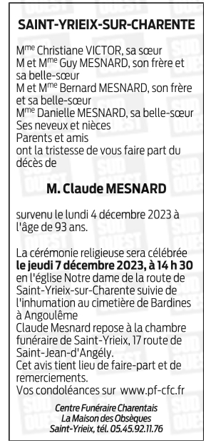 Décédé à Fléac (16730, France) le lundi 4 décembre 2023 à l'âge de 93 ans
