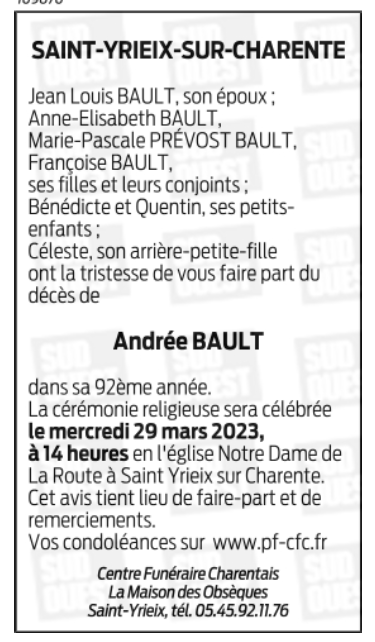Décédée à Saint-Yrieix-sur-Charente (16710, France) le samedi 25 mars 2023 à l'âge de 91 ans