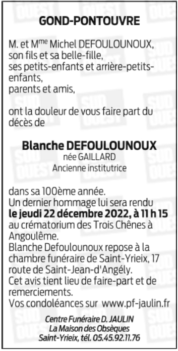 Décédée à Angoulême (16000, France) le jeudi 15 décembre 2022 à l'âge de 99 ans