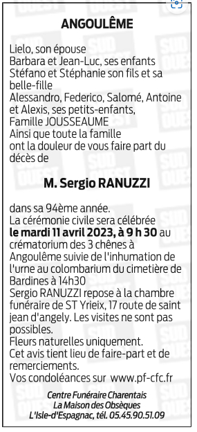 Décédé à Angoulême (16000, France) le mardi 4 avril 2023 à l'âge de 93 ans
