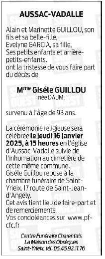 Décédée à Saint-Porchaire (17250, France) le lundi 13 janvier 2025 à l'âge de 93 ans