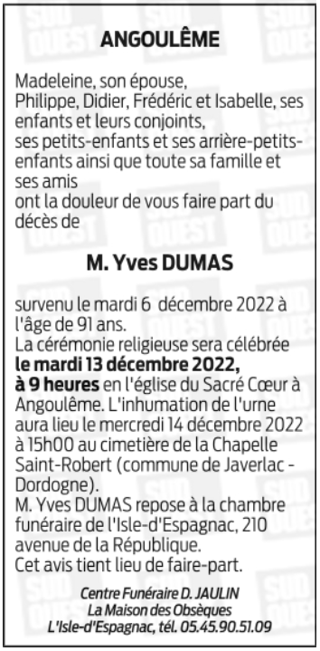 Décédé à Saint-Michel (16470, France) le mardi 6 décembre 2022 à l'âge de 91 ans