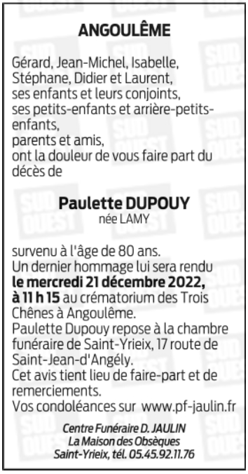 Décédée à Angoulême (16000, France) le mercredi 14 décembre 2022 à l'âge de 80 ans