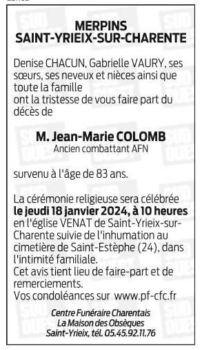 Décédé à Merpins (16100, France) le vendredi 12 janvier 2024 à l'âge de 83 ans