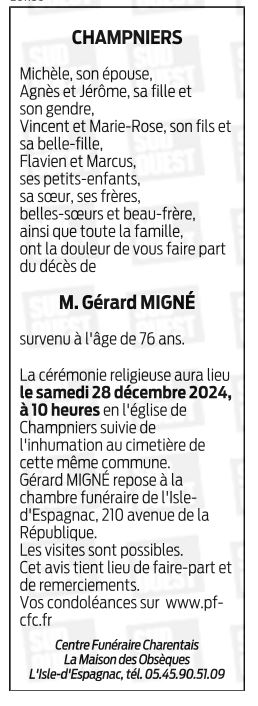 Décédé à Saint-Michel (16470, France) le samedi 21 décembre 2024 à l'âge de 76 ans