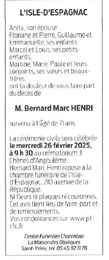 Décédé à L'Isle-d'Espagnac (16340, France) le vendredi 21 février 2025 à l'âge de 71 ans