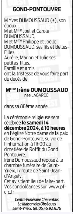 Décédée à La Rochefoucauld (16110, France) le dimanche 8 décembre 2024 à l'âge de 87 ans
