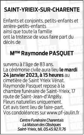 Décédée à Saint-Michel (16470, France) le samedi 21 janvier 2023 à l'âge de 83 ans