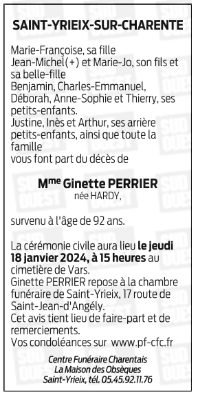 Décédée à Ruelle-sur-Touvre (16600, France) le dimanche 14 janvier 2024 à l'âge de 92 ans