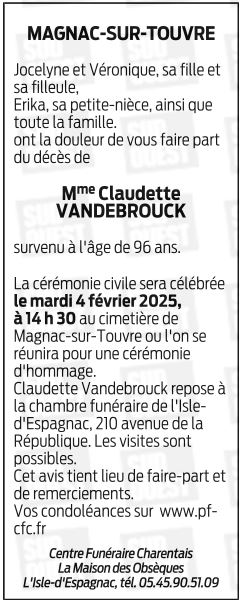 Décédée à La Rochefoucauld (16110, France) le mercredi 29 janvier 2025 à l'âge de 96 ans